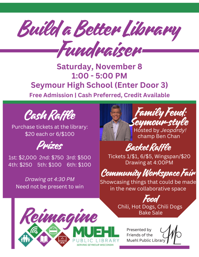 Our library star is Jason Wolf who manages Don’s Quality Market. In a dazzling pink and blue sparkly jacket he got the crowd fired up on November 8, 2025 in the Seymour High School auditorium for Family Feud Seymour style! We are so grateful for Jason’s good nature and humor. Later, during the BUILD A […]