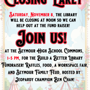 Library closing early so staff can be at fundraiser Your library will be closing at noon. Thanks for your understanding. 08 Nov 10:00 am - 12:00 pm